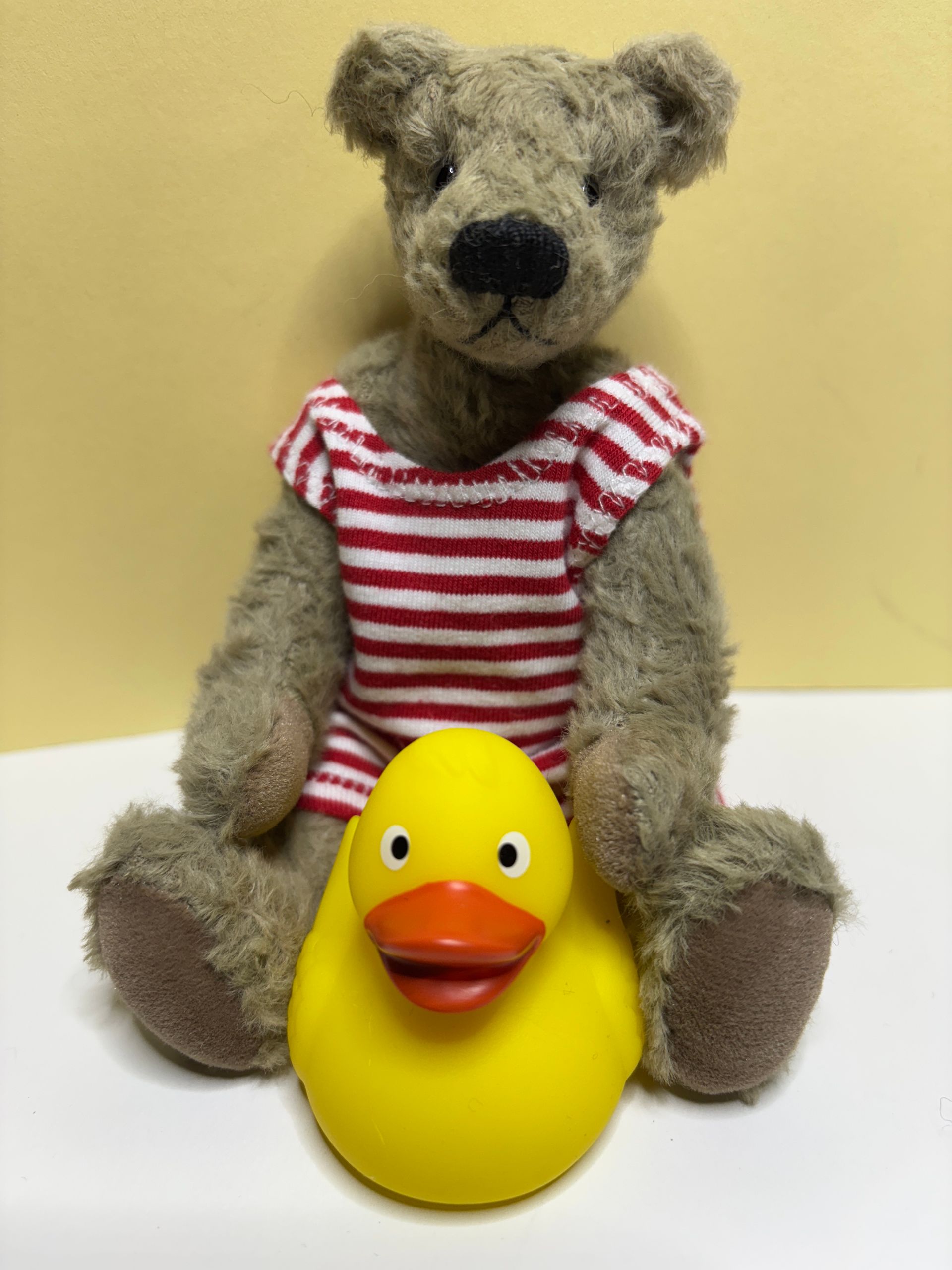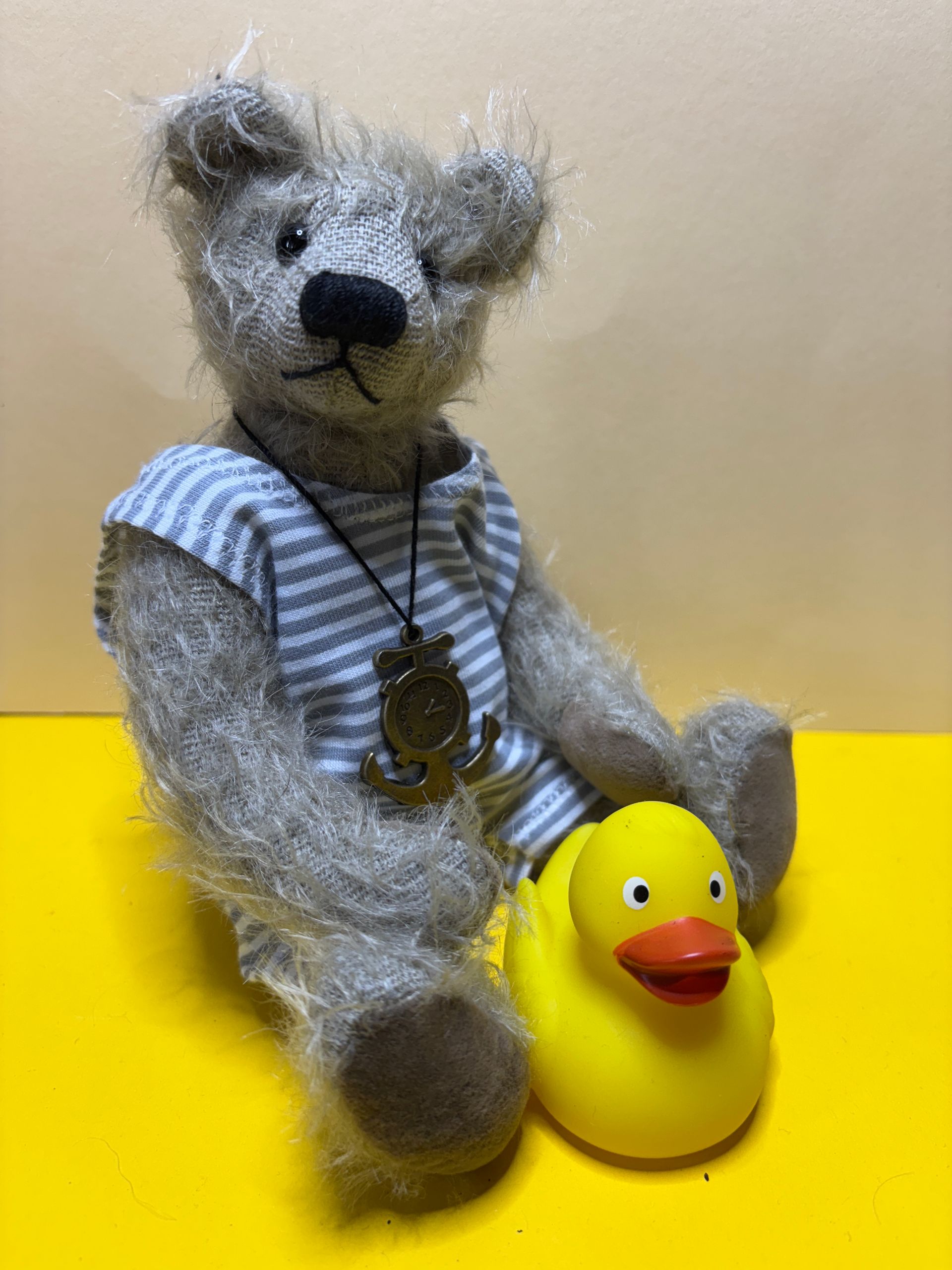 Harry ist 30 cm groß und aus grauem Mohair genäht. Er ist mit Schafswolle und etwas Stahlgranulat gefüllt. Preis: 125,00 Euro